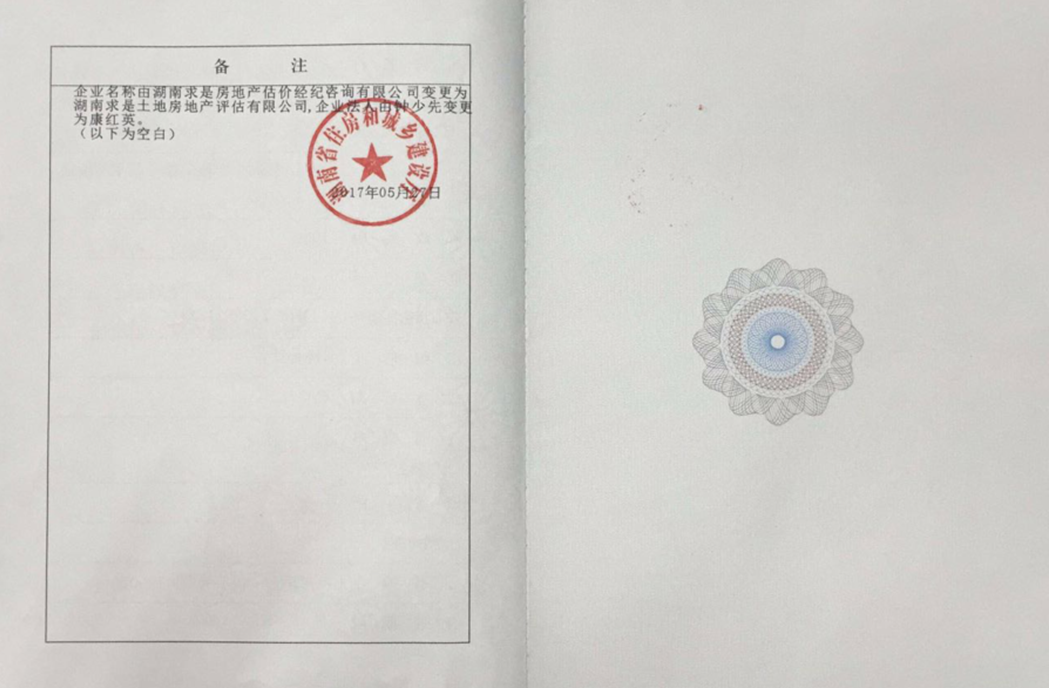 房地產(chǎn)評(píng)估公司名稱由“湖南求是房地產(chǎn)估價(jià)經(jīng)紀(jì)咨詢有限公司”變更為“湖南求是土地房地產(chǎn)評(píng)估有限公司”,公司法人由“鐘少先”變更為“康紅英”。